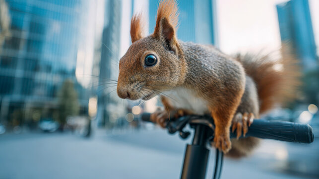 An urban squirrel sitting on the handlebars of an electric scooter, a playful moment of wildlife on a modern city street