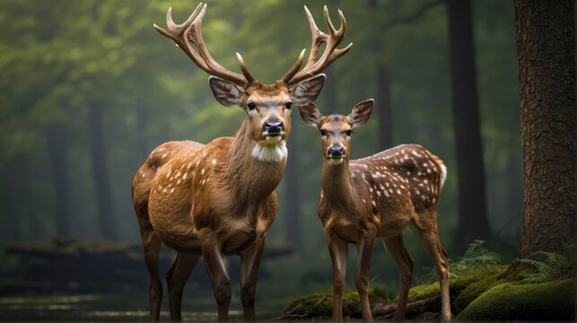 Majestic deer with large antlers stands alert in front of misty forest, creating serene and captivating wildlife scene in natural habitat