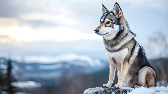 A Swedish Vallhund sitting gracefully on a , showcasing its distinctive wolf-like appearance and alert expression