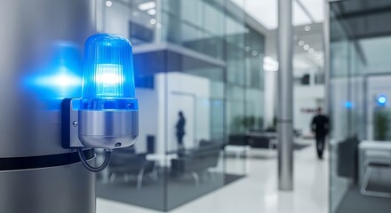 Flashing blue emergency light in a modern office building signaling an alert warning or security breach with blurred background tr