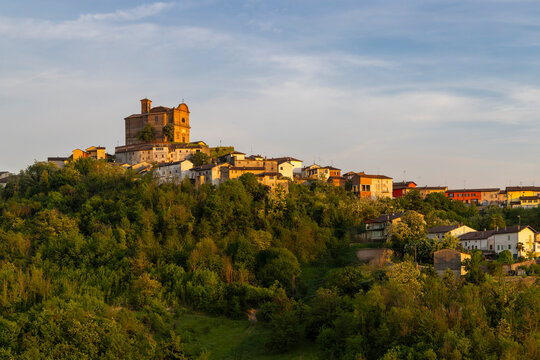 Panoramic drone picture of Castello Cereseto in Piedmont in the evening
