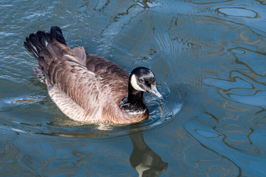 Branta hutchinsii leucopareia. Aleutian cackling goose swims. Bird with black head and neck, white cheek patches, grayish brown back and wings, white rump, black tail feathers, legs. Close up portrait