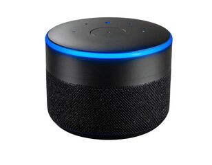 Voice controlled speaker with activated voice recognition, on light background.