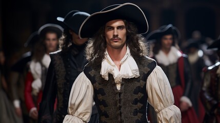 Male models showcase on the runway a clothing collection inspired by the musketeer characters from the novels of Alexandre Dumas