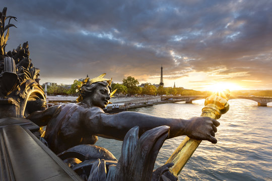 Street lantern on the Alexandre III Bridge with the Eiffel Tower in the background in Paris, France. Architecture and landmarks of Paris. Sunset cityscape of Paris