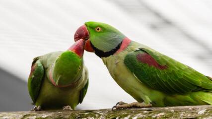 Closeup of a pair of Alexandrine parakeets sitting on a branch