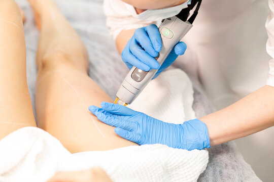 leg epilation procedure in cosmetology clinic, cosmetologist makes depilation with alexandrite laser
