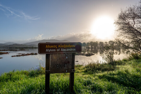 A salt marsh, wetland wildlife habitat in Autumn dawn with the name sign Alykes of Alexandros.