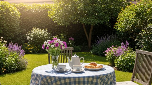 A beautifully set garden table stands ready for an alfresco dining experience surrounded by lush greenery and blooming flowers under a wooden pergola.