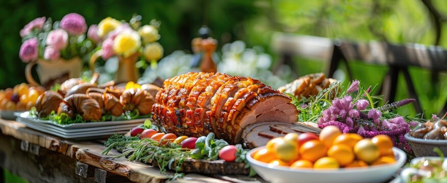 Gourmet food display outdoor setting. Fresh fruits vegetables cheeses, bread arranged on rustic wooden boards. Wine glasses filled with rose wine. Outdoor alfresco dining experience. Fine dining