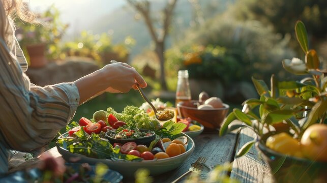 Sunlit alfresco gathering passing dishes on wooden table with green glitch