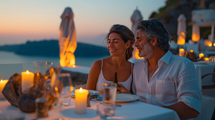 Romantic couple dining in sunlit restaurant setting