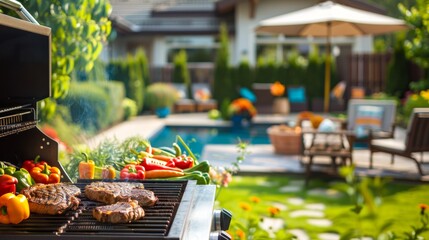 Backyard Barbecue with Built-In Gas Grill, Steaks, Vegetables, and Beautiful Landscaped Yard