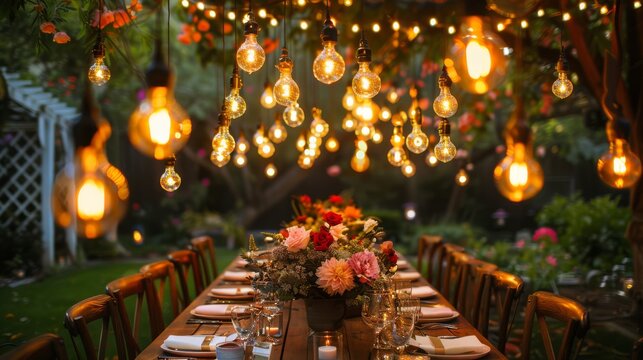 Elegant outdoor dinner setting with string lights, floral arrangements, and wooden furniture in a lush garden at twilight.