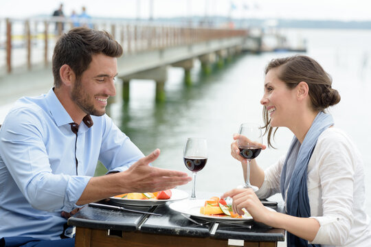 Friends enjoying alfresco dinner on deck sharing wine and food with binary code overlay