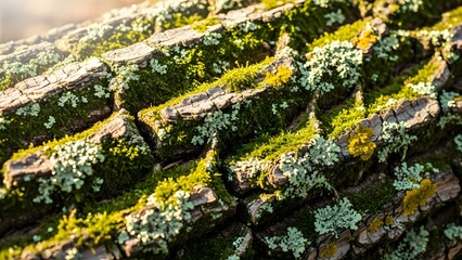 Close-up texture of a tree bark covered in green moss, highlighting the rugged natural details and organic growth