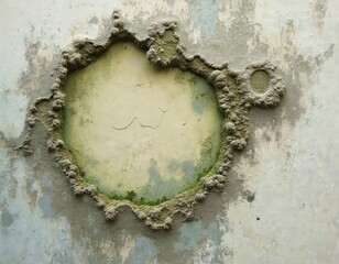 Weathered plaster cement wall texture with fungal algae and moss growth. Fungal and mildew damage on wall surface. Grunge background, antique, vintage, weathered, stained surface.
