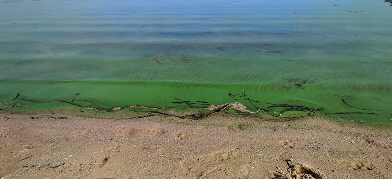 Water pollution by blooming blue green algae - is world environmental problem. Water bodies, rivers and lakes with algal blooms. Ecology, polluted nature.