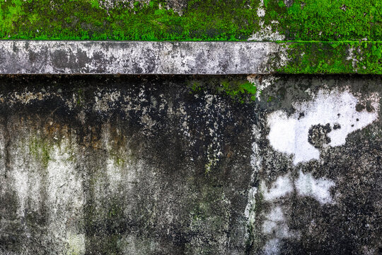 Concrete wall texture with mossy streaks, damp surface, green algae