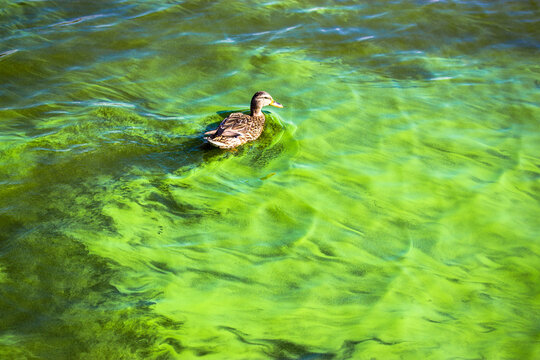 Wild brown mallard duck, Anas platyrhynchos bird swimming in swampy algae polluted water. Green blooming water body of lake, river, sea. Environmental problems. Ecological crisis. Scarcity of oxygen.