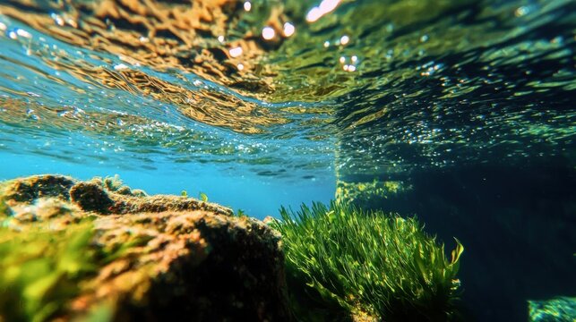 Underwater rocks covered in vibrant green moss. Clear water, sunlight filtering through