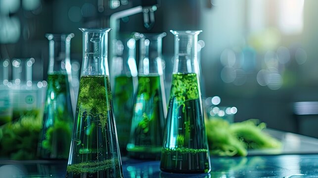 Four containers with green liquid, likely algae or plant extract, displayed on a lab table with a person in the background.