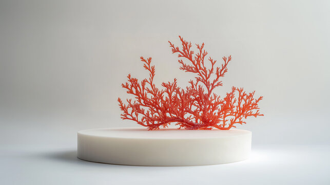 Front view of seaweed leaves on flasks and transparent podium decorated on backlit background Scene for advertising cosmetic of seaweed extract has the effect of treating acne detoxing : Generative AI