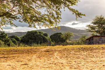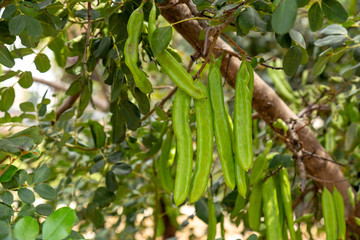 Algaroba or The carob, a leguminous tree of the Mediterranean region. Closeup on green beans on a tree.