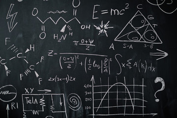 Background shot of blackboard with scientific and algebraic formulas and graphs written on it in chalk