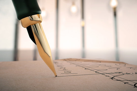 Background shot of blackboard with scientific and algebraic formulas and graphs written on it in graphics. Business concept - sketch with schemes and graphs on chalkboard. 3D Graphics cartoon formula