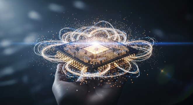 Futuristic microchip processor with swirling energy in a hand illustrating technology innovation