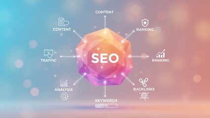 A visual representation of Search Engine Optimization (SEO) components, including content, ranking, traffic, analysis, keywords, and backlinks, on a colorful background.
