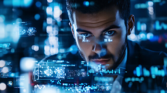 Scientist analyzing blood tests with data overlays