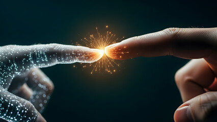 Primer plano de dedos de robot y humano tocándose con una chispa digital brillante representando transferencia de datos y conexión neuronal