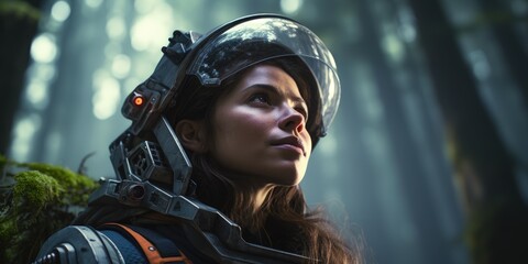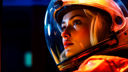 Portrait of female astronaut in spacesuit on alien planet like in sci-fi movie, adult girl in futuristic helmet outside spaceship. Concept of space, young woman, people, future Generated image