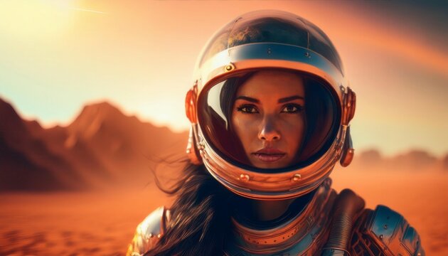close up female astronaut stands on surface of mars with reflection of  red planet in helmet. Space explorer on a mission, sci-fi illustration concept for exploration.