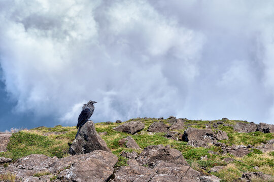 A raven alighted on a rock in the top of a mountain with a cloudy sky on the background.