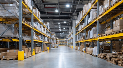 Aisle of a modern warehouse illuminated with soft lights and storage shelves aligned neatly : Generative AI