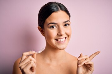 Young beautiful woman holding dental orthodontic aligner corrector over yellow background pointing with finger to the camera and to you, hand sign, positive and confident gesture from the front