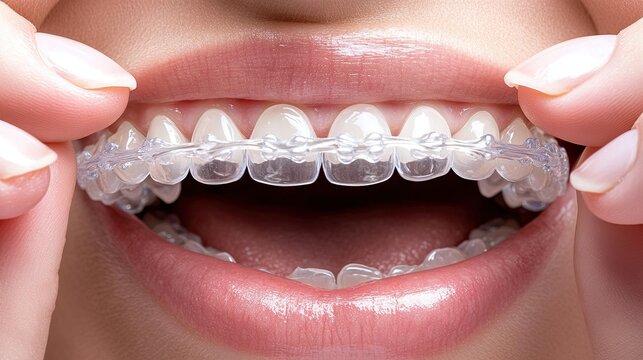 Dental care. Smiling beautiful woman holding heart-shaped aligners. Plastic retainers for teeth alignment.