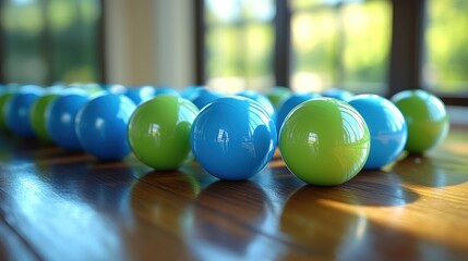 Green blue spheres align on wooden table, sunlit room