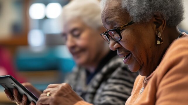 A senior citizen learning how to use a tablet in a community center, guided by a patient instructor, with other seniors participating in similar activities, emphasizing the importance of digital