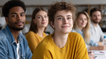A diverse group of students with smiling expressions are focused on an unseen subject. They are in a classroom or a similar learning environment.