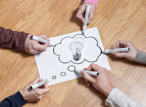 Thinking speech bubble balloon with light bulb. Brainstorming new ideas together for marketing plan or school project. Teamwork, synergy and education. Group of people drawing to same paper.