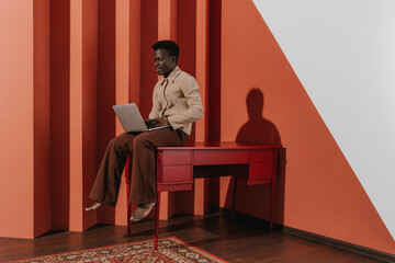 A fashionable man with a laptop in a creative interior in the morning