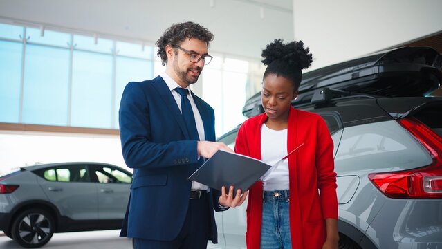 Mixed-raced people glancing at camera at same time. Attractive man in business costume holding folder and standing next to pretty woman. Consultant and client happy about successful deal.