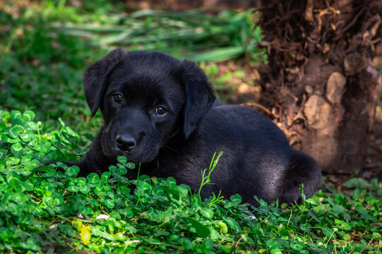 Portrait of a cute dog lying in the green grass.
