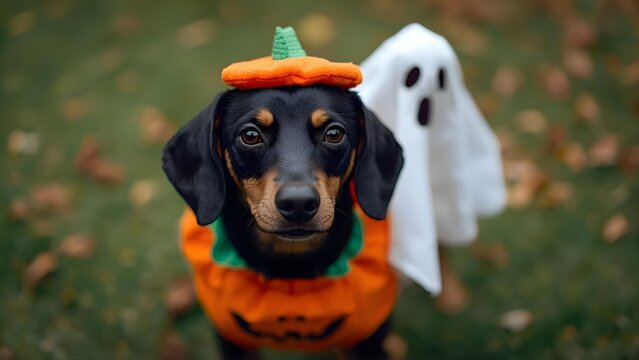 A cocker spaniel dog dressed in a white ghost costume sits outdoors. The dog appears calm and happy, surrounded by greenery.