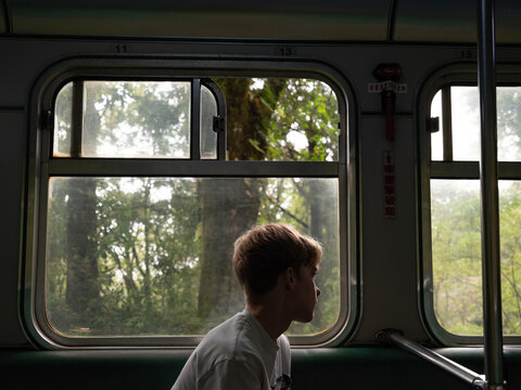 Teenage boy on the Alishan Forest Train in Taiwan.