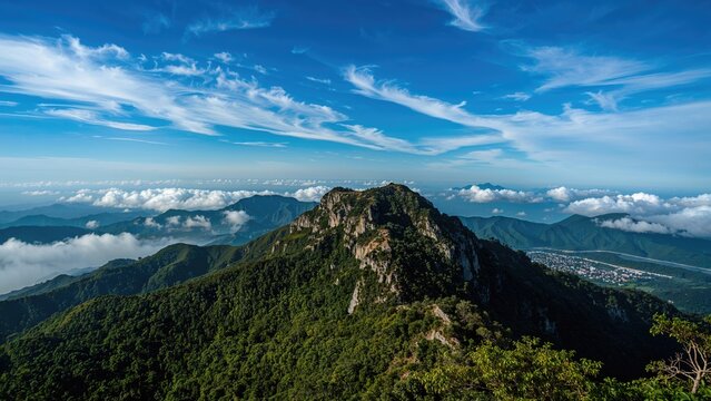 An awe-inspiring sight of rugged mountain summits covered in rich greenery beneath a vast blue sky, evoking serenity.